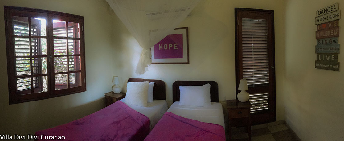 - Une chambre avec 2 lits simples et une salle de bain semi-privée (avec douche et toilette) et un ventilateur de plafond